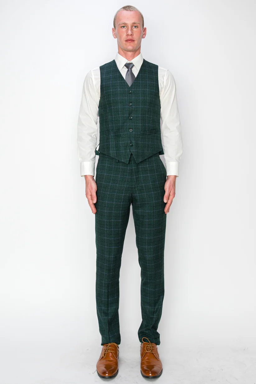 The matching Forest Green Plaid Vest is the perfect complement to the jacket, offering a sleek, tailored fit that enhances the overall look. The subtle plaid pattern adds depth and style, while the adjustable back straps ensure a customized, comfortable fit. Worn under the jacket for a complete 3-piece look or on its own for a more relaxed style, this vest exudes effortless sophistication and elevates your entire outfit.