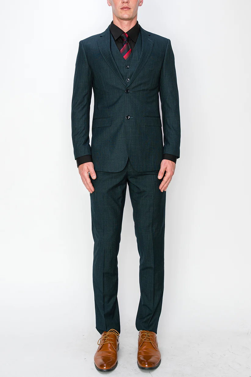 The coordinating vest adds an extra layer of sophistication to the ensemble, crafted from the same textured green fabric for a seamless look. Its slim, tailored fit enhances your posture and adds depth to the suit. Whether worn under the jacket or on its own, the vest offers a refined and confident style that is sure to turn heads.