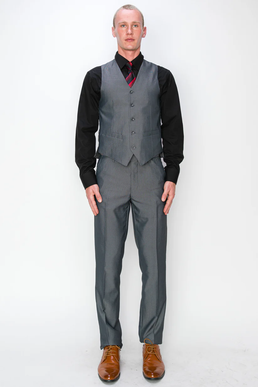 The coordinating vest adds an extra layer of elegance, with its slim cut and seamless matching grey textured fabric. Its fitted design offers a polished, sharp look and works perfectly under the jacket or on its own for a sleek, confident appearance. The vest’s sophisticated style adds depth and dimension to the overall ensemble.
